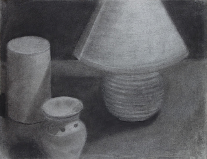 This charcoal study by Chris Fiedler masterfully captures the essence of a still life setup, focusing on form, light, and shadow. The composition is simple yet effective, with a lamp, a candle burner, and a cylinder shape from the art school, all rendered in a range of light greys. The tonal control is outstanding, with a clear distinction between the objects and the background. The study demonstrates Fiedler's ability to control the medium, creating a piece that is both grounded and specific.