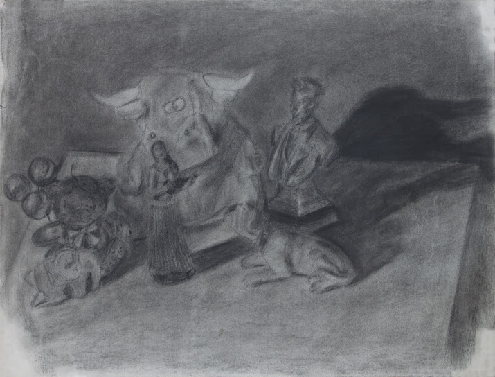 The charcoal artwork, created by Chris Fiedler, presents a study in form and light. The subject is rendered with a focus on structure and composition, with varying shades of gray used to create depth and dimension. The artist's use of tonal control is evident in the subtle gradations of light and shadow, which add to the overall sense of realism. The piece is a demonstration of the artist's skill in capturing the subtleties of form and light through the medium of charcoal.